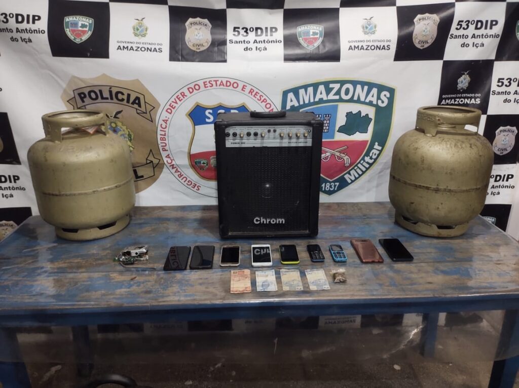 Dentre os produtos dos crimes recuperados, estavam nove aparelhos celulares de diversas marcas; dois botijões de gás GLP de 13 quilos cada; uma caixa de som tamanho médio; uma máquina fotográfica digital; oito porções de substâncias com aspecto de pasta base de cocaína; uma porção média de maconha; e R$ 16 em espécie.