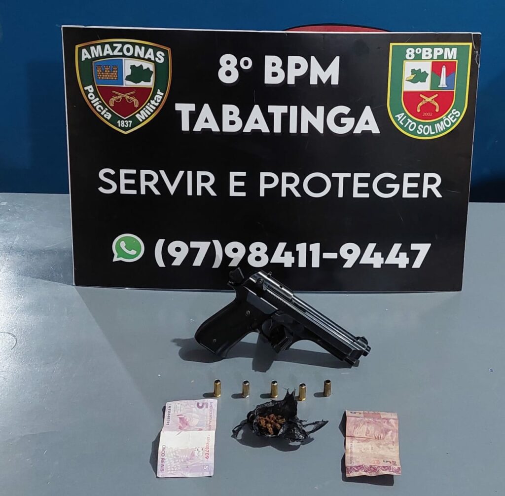 Os policiais foram até o local, onde identificaram o suspeito e o abordaram. Na revista pessoal, encontraram, em sua cintura, uma pistola calibre 9mm, marca Ekol Firat Magnum, com cinco munições intactas; e em seu bolso, um papelote de substância com característica de maconha, além de R$ 10 em espécie. Com base no flagrante, ele foi encaminhado para a delegacia de Tabatinga para a conclusão dos procedimentos legais.