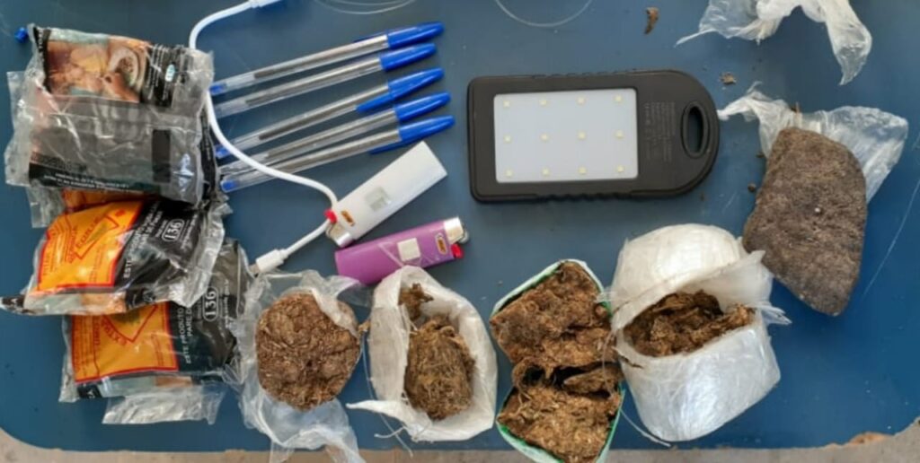 Na manhã de domingo, por volta das 6h, os militares flagraram, por meio das câmeras de vigilância, diversos materiais ilícitos sendo arremessados para dentro da unidade prisional do município. As equipes recolheram o material ilícito, sendo quatro papelotes de substância com aspecto de maconha, dois celulares, carregadores e chips de celular. O material foi apresentado à delegacia para adoção das medidas cabíveis.
