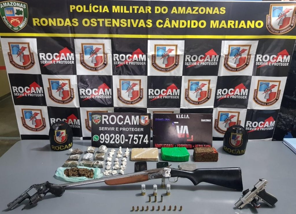 Policiais militares das Rondas Ostensivas Cândido Mariano (Rocam) detiveram, na madrugada desta quinta-feira (26/11), uma mulher, 20 anos, e um homem, 31 anos, por porte ilegal de arma de fogo, tráfico de drogas e receptação. A ação ocorreu no município de Tabatinga, distante 1.108 quilômetros em linha reta de Manaus.