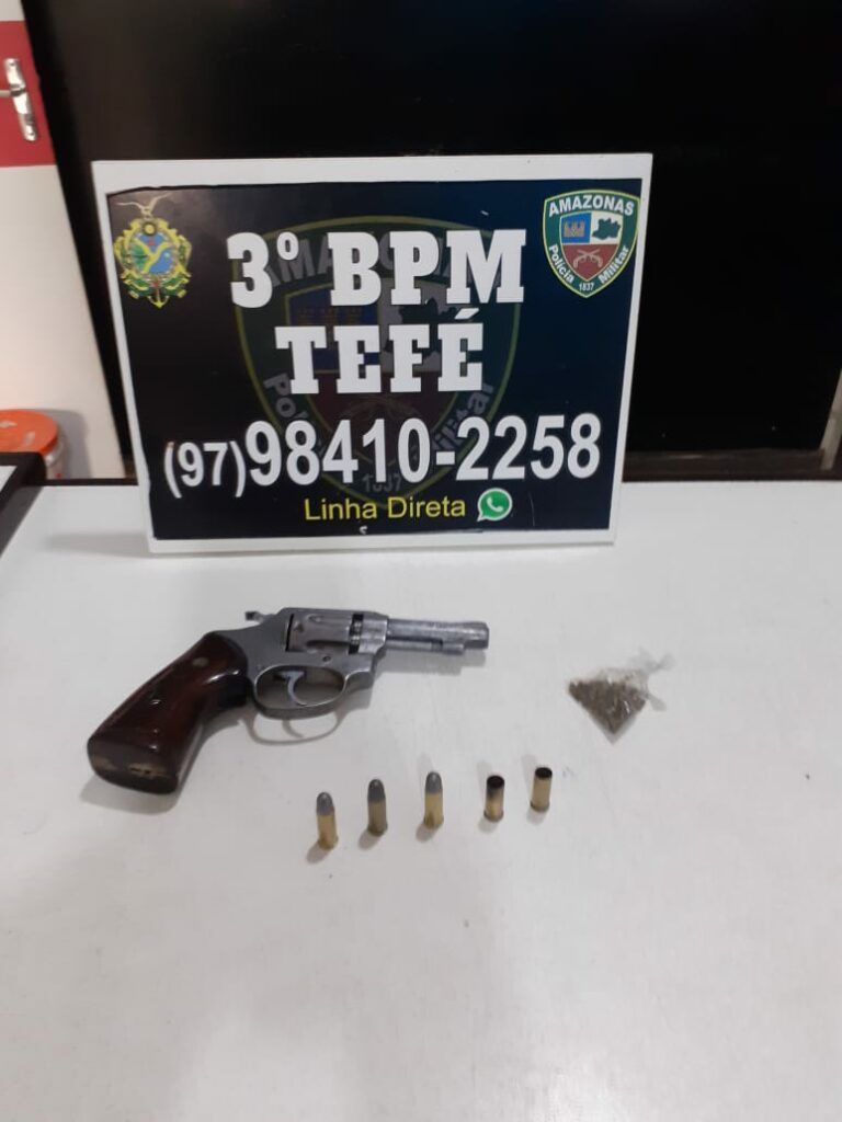 Em seguida, todos foram revistados, quando foi encontrada uma porção média de substância com aspecto de maconha do tipo skunk; cinco munições de calibre 32; com três intactas e duas deflagradas; um cigarro de maconha skunk; um revólver Rossi calibre 32, numeração parcialmente suprimida; e uma motocicleta Honda Pop, cor prata.