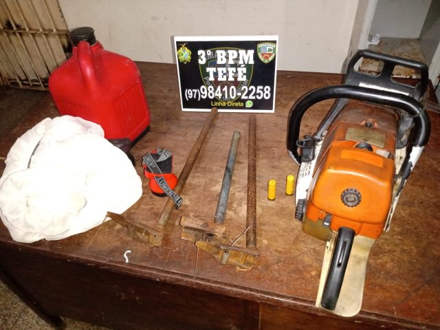 Foram feitas buscas na casa e encontrados uma motosserra, três armas caseiras, dois cartuchos calibre 20 e duas lanternas. Diante dos fatos, o material apreendido foi conduzido à Delegacia Interativa de Polícia (DIP) de Tefé para os procedimentos legais.
