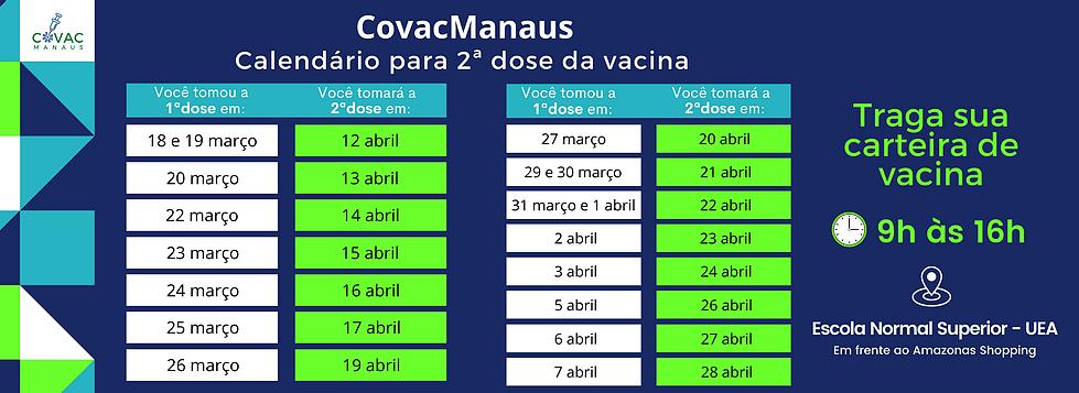 A partir da próxima segunda-feira (12/04), começa a aplicação da segunda dose da vacina, seguindo o calendário da pesquisa. O cronograma segue até o dia 28 de abril. Os imunizados entre os dias 18 e 26 de março receberão a segunda dose entre os dias 12 e 19 de abril, exceto no dia 18. Aqueles que foram vacinados entre 27 de março e 7 de abril tomarão a segunda dose no período de 20 a 28 de abril (confira calendário detalhado abaixo).