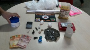 O foragido da Justiça Calby Souza de Paula, de 31 anos, foi preso nesta manhã (17) com 1 quilo e meio de cocaína e 15 porções de oxi, cocaína e maconha, uma balança de precisão e material para embalagem de droga.