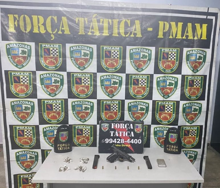 Ao todo, os policiais encontraram uma pistola Taurus 57S, calibre 765, com numeração aparente e quatro munições do mesmo calibre; dois carregadores alongados; 40 trouxinhas de entorpecentes com característica de maconha do tipo skunk; e uma balança de precisão.