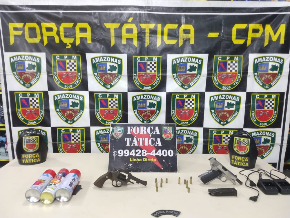 Policiais militares da Força Tática detiveram, na noite de terça-feira (11/08), dois homens por posse ilegal de arma de fogo no bairro Compensa, zona oeste da capital. Com eles, os policiais apreenderam um revólver calibre 38, com numeração suprimida, uma pistola 380, com numeração suprimida, três munições calibre 38, intactas, sete munições calibre 380, intactas, dois carregadores de rádio comunicador e um aparelho celular Samsung.