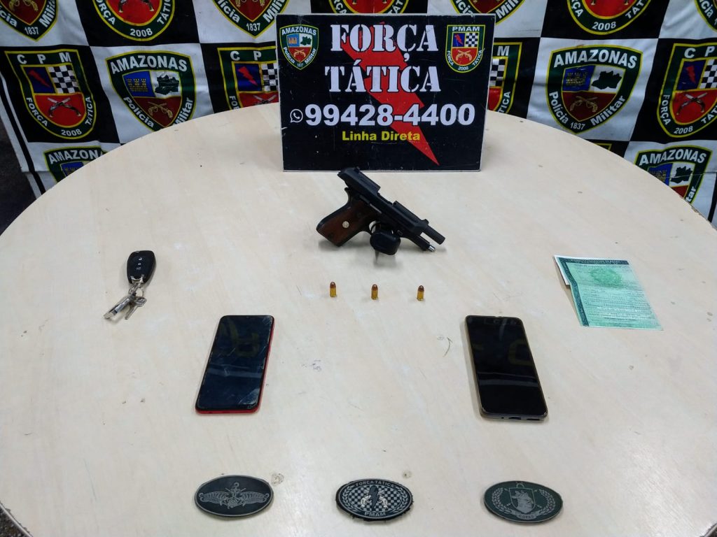 Policiais militares da Força Tática detiveram, na tarde desta sexta-feira (11/09), um homem de 24 anos por porte ilegal de arma de fogo, no bairro Nova Floresta, zona leste da capital. Com ele, os policiais apreenderam uma pistola Taurus, calibre 380, numeração NIF17198; três munições calibre 380 intactas; dois aparelhos celulares; e um veículo modelo Onix, de placas QZO-5G98.