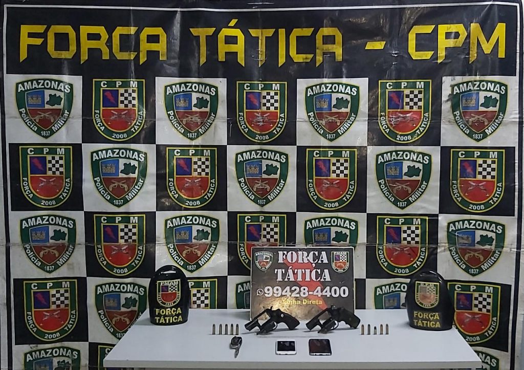 Policiais militares da Força Tática detiveram, na noite de segunda-feira (28/09), um homem de 22 anos por porte ilegal de arma de fogo no bairro Distrito Industrial, zona leste da capital. Com ele, os policiais apreenderam um revólver calibre 38, marca Taurus, numeração EE57608; um revólver calibre 38, marca Rossi, numeração suprimida; 10 munições calibre 38, intactas; dois aparelhos celulares; e um veículo modelo VW Crossfox.