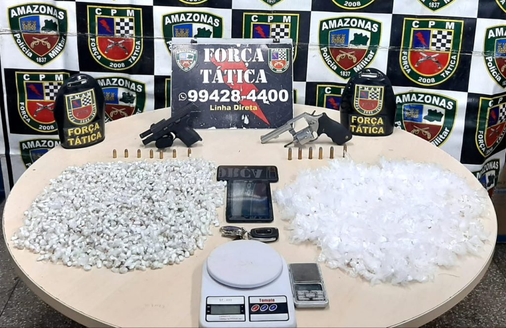 Policiais militares da Força Tática do Comando de Policiamento Metropolitano (CPM) detiveram um jovem de 20 anos e apreenderam um adolescente de 17, nesta quarta-feira (28/10), por volta das 3h. Eles foram encontrados portando armas de fogo e drogas em um veículo Hyundai HB20, de cor branca e placa PWU 1389, que estava estacionado na rua A, Comunidade Santa Inês, bairro Jorge Teixeira, zona leste de Manaus.