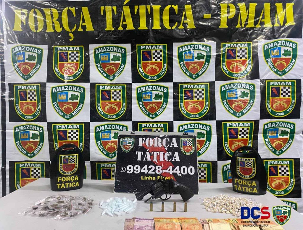 Por volta das 23h20 desta quarta-feira (4/11), policiais militares da Força Tática do Comando de Policiamento Metropolitano (CPM) detiveram um jovem de 18 anos, que estava em posse de arma de fogo, munições, dinheiro e material entorpecente na rua Major Gabriel, bairro Praça 14 de Janeiro, zona sul da capital amazonense.