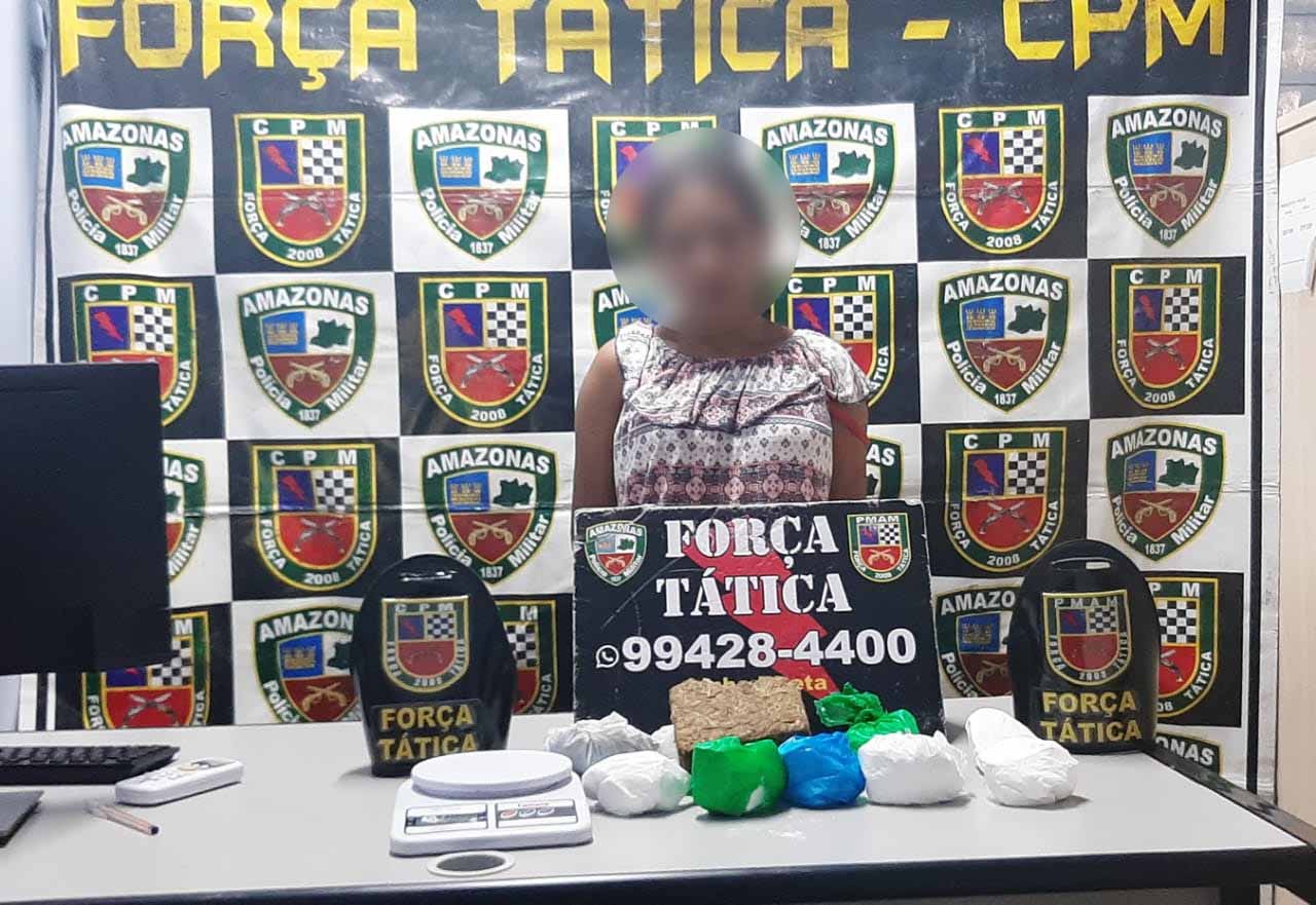 Policiais militares da Força Tática detiveram, na manhã desta quarta-feira (30/10), uma mulher de 18 anos suspeita de tráfico de drogas no bairro Cidade Nova, zona norte da capital. Com ela, os policiais apreenderam sete porções de supostamente cocaína, totalizando 900g, dois pequenos tabletes de supostamente maconha tipo skunk, pesando aproximadamente 600g, e uma balança de precisão.