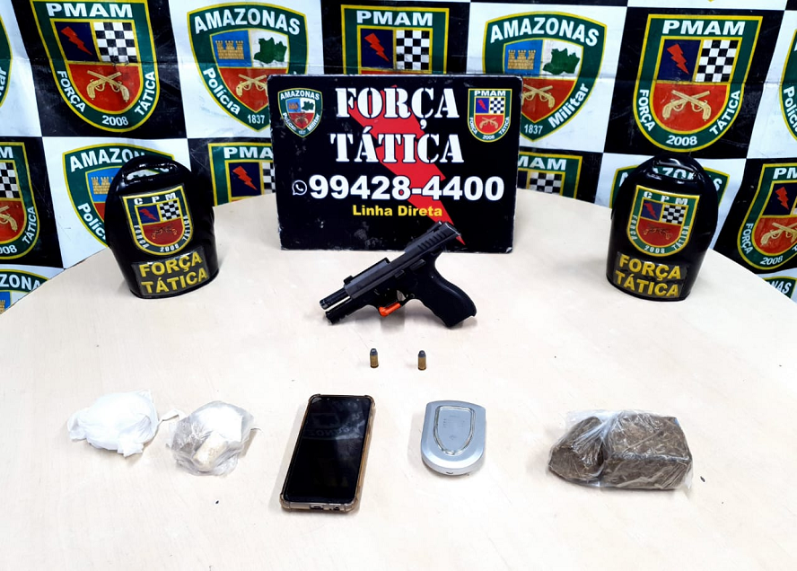 Policiais militares da Força Tática detiveram, na madrugada desta segunda-feira (05/07), um homem de 20 anos em posse ilegal de uma pistola de uso restrito das forças policiais e substâncias entorpecentes, na zona leste de Manaus.