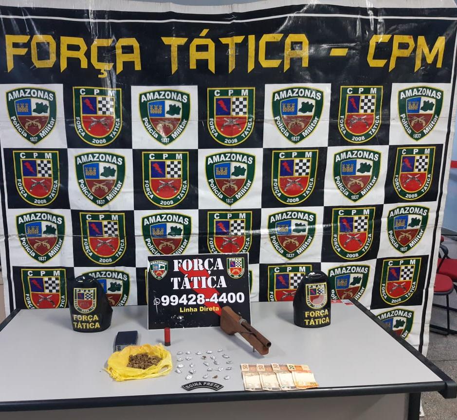 Policiais militares da Força Tática detiveram, na noite desta segunda-feira (30/03), dois homens suspeitos de porte ilegal de arma de fogo e tráfico de drogas no bairro Redenção, zona centro-oeste da capital. Com os suspeitos os policiais apreenderam uma arma de fabricação caseira, uma munição calibre 12, 24 porções de supostamente entorpecentes e a quantia de R$ 170,00 em espécie.