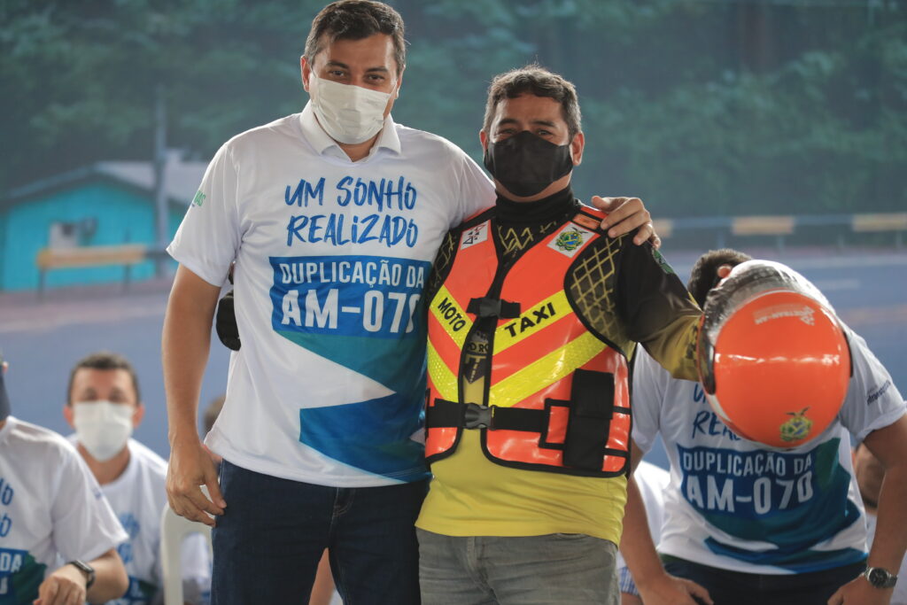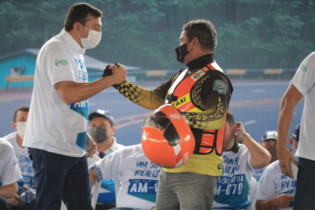 O governador Wilson Lima deu início, nesta segunda-feira (20/12), à entrega de 260 kits de segurança, com capacete e colete, para mototaxistas de Manacapuru (a 68 quilômetros de Manaus) beneficiados pelo projeto Mototaxista Legal. Realizado pelo Governo do Amazonas, o projeto é coordenado pelo Departamento Estadual de Trânsito (Detran-AM). As entregas ocorreram durante a inauguração das obras de duplicação e modernização da AM-70, rodovia que interliga a capital a Manacapuru. Na ocasião, os profissionais foram pré-cadastrados para terem acesso ao crédito de R$ 5 mil junto à Agência de Fomento do Estado do Amazonas (Afeam).