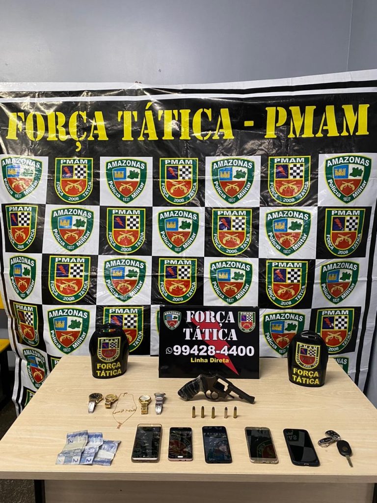 Durante as diligências e informações repassadas pela empresa por meio do rastreamento em tempo real, os militares localizaram o veículo na rua Anápolis, bairro Redenção, na zona centro-oeste. No carro estavam quatro homens, com os quais foi encontrada uma arma de fogo calibre 38, numeração suprimida, da marca Taurus e cinco munições para o mesmo calibre intactas.