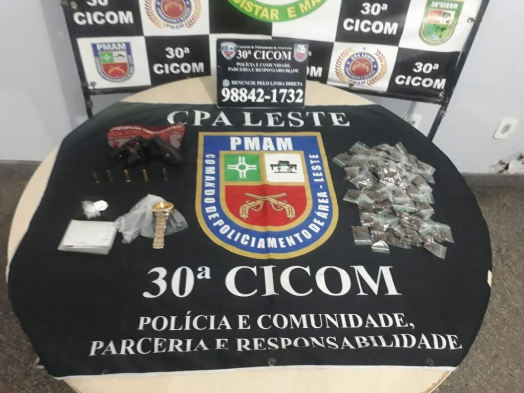 Foram apreendidos um revólver calibre 38 com cinco munições intactas e numeração aparente, além de um pacote com 100 porções de maconha e uma de cocaína. (Foto: Divulgação/PMAM)