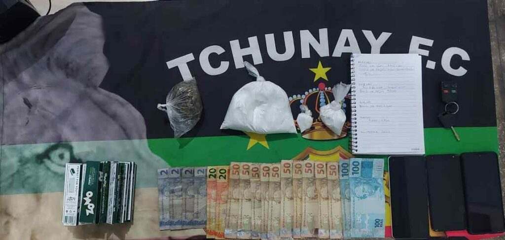 Em revista pessoal e buscas no local, foram encontrados e apreendidos uma porção pesando 500 gramas e mais duas porções médias de substância análoga a cocaína; uma porção média de maconha; R$ 748 em espécie; e um caderno de anotações.