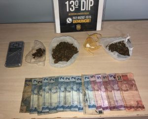 Na tarde de quinta-feira (15/08), por volta das 15h, a equipe de investigação do 13° Distrito Integrado de Polícia (DIP), sob o comando do delegado Ricardo Cunha, titular da unidade policial, prendeu, em flagrante, Diego Pereira dos Santos, 24, conhecido como “Boca de Sapo”, e apreendeu um adolescente de 17 anos, conhecido como “De menor”, por comercializarem drogas, no bairro Cidade de Deus.