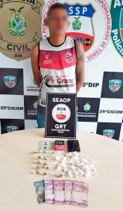 Denunciado por tráfico de drogas, Sebastião Monteiro de Souza, 24, conhecido como “Preto”, foi preso em flagrante na manhã desta segunda-feira (09/07) por policiais da Secretaria Executiva Adjunta de Operações (Seaop), da Secretaria de Segurança Pública do Amazonas (SSP-AM), na Rua Bom Jesus, localizada no bairro Zumbi 3, zona leste de Manaus. Com ele, foram apreendidas 24 trouxinhas de oxi e 15 de maconha escondidas, além de dois celulares.