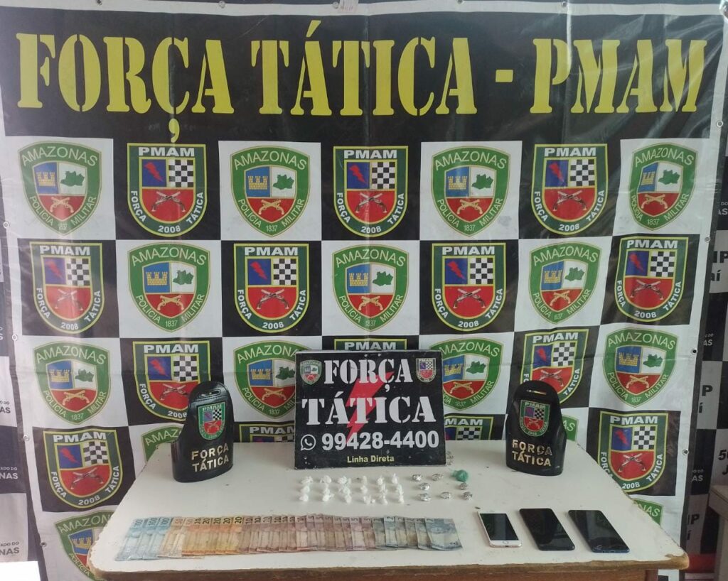 Durante a revista pessoal, os agentes encontraram com o suspeito 26 pequenas porções de drogas, entre maconha e cocaína, além de R$ 617 em espécie e três celulares.