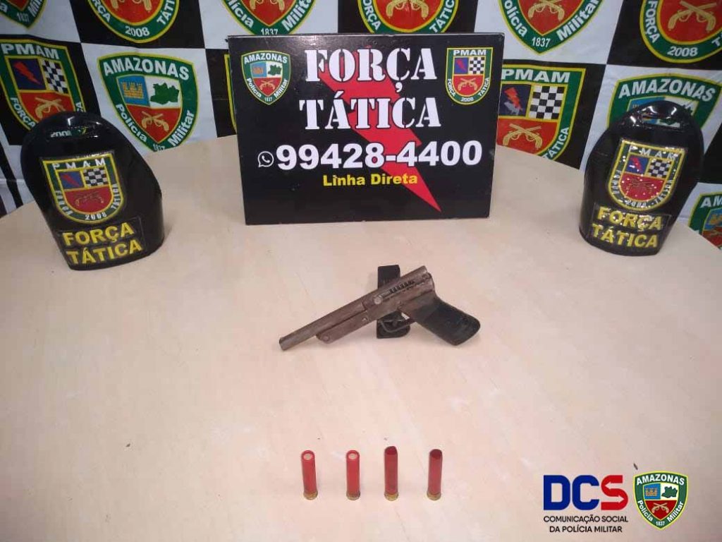 Ao chegar ao local, os policiais realizaram abordagem a um jovem com as características informadas na denúncia, e com ele encontraram uma arma de fabricação caseira calibre 36, com quatro munições para o mesmo calibre, sendo duas deflagradas e duas intactas.