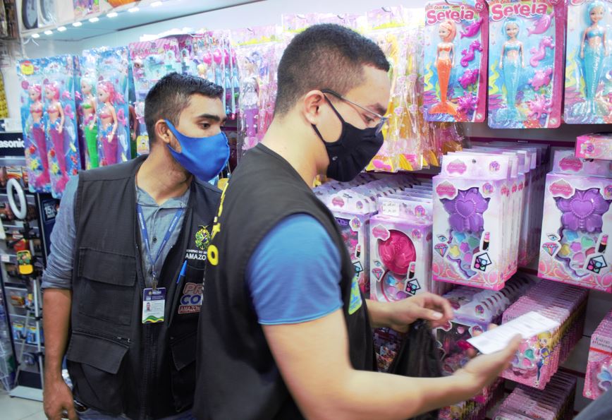 Lojas de brinquedos e roupas infantis do Centro de Manaus foram alvo da operação Fake Toy, realizada pela Delegacia Especializada em Crimes contra o Consumidor (Decon), Instituto de Defesa do Consumidor (Procon-AM) e Instituto de Pesos e Medidas do Estado do Amazonas (Ipem-AM). A ação ocorreu nesta quinta-feira (30/09) e resultou na apreensão de aproximadamente 1.250 produtos irregulares.