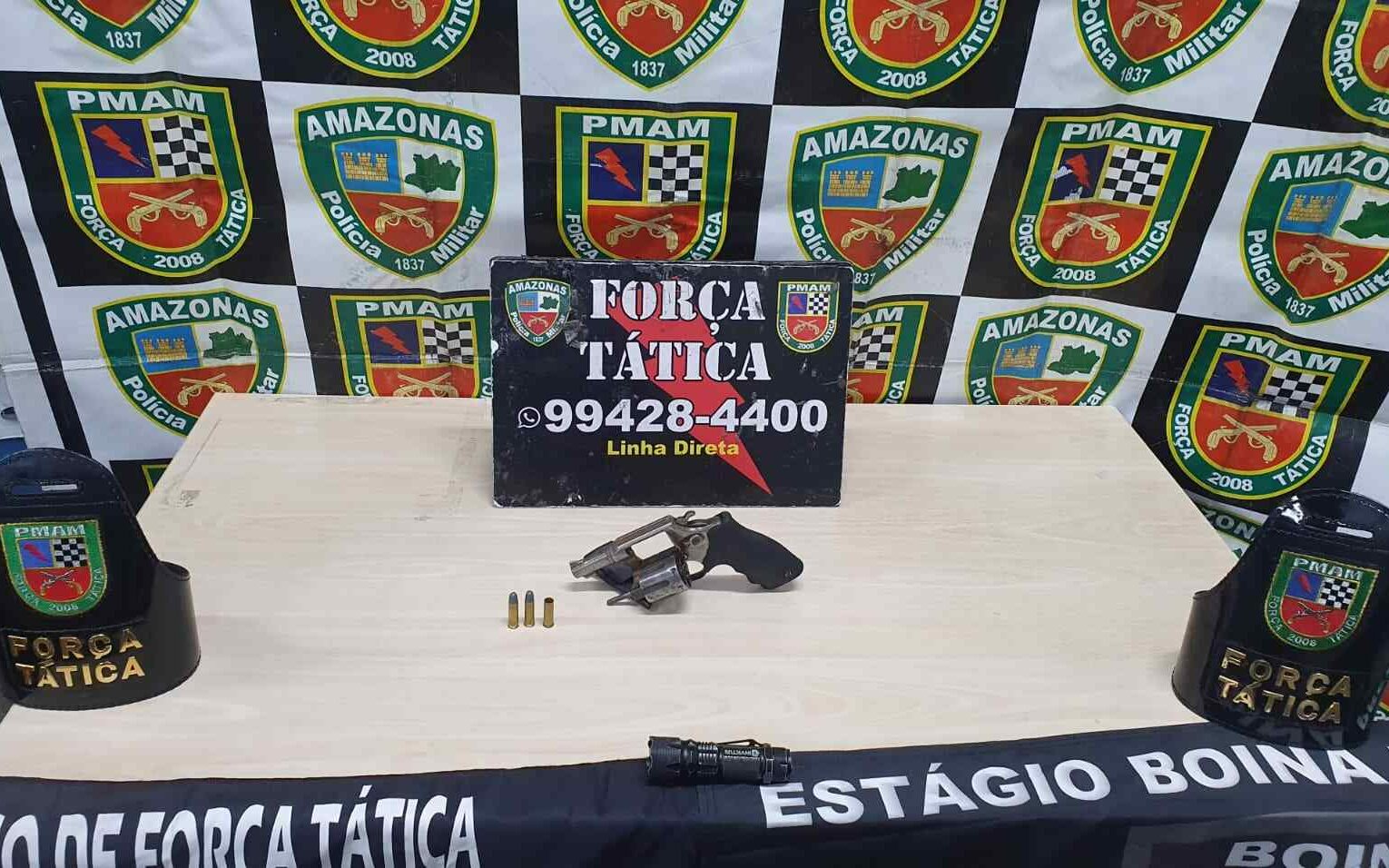 Em outra ação, por volta das 20h, a equipe policial tática apreendeu uma arma de fogo após abordagem a um indivíduo em atitude suspeita na rua Pena Dourada, no conjunto habitacional Viver Melhor 3, bairro Monte das Oliveiras, zona norte. Ao notar a viatura, o suspeito começou a fugir, mas foi alcançado pelos policiais. Na revista pessoal, foi encontrado com ele um revólver calibre 38, de numeração suprimida, com duas munições intactas e uma deflagrada. O homem foi conduzido, juntamente com o armamento, para o 6º DIP.