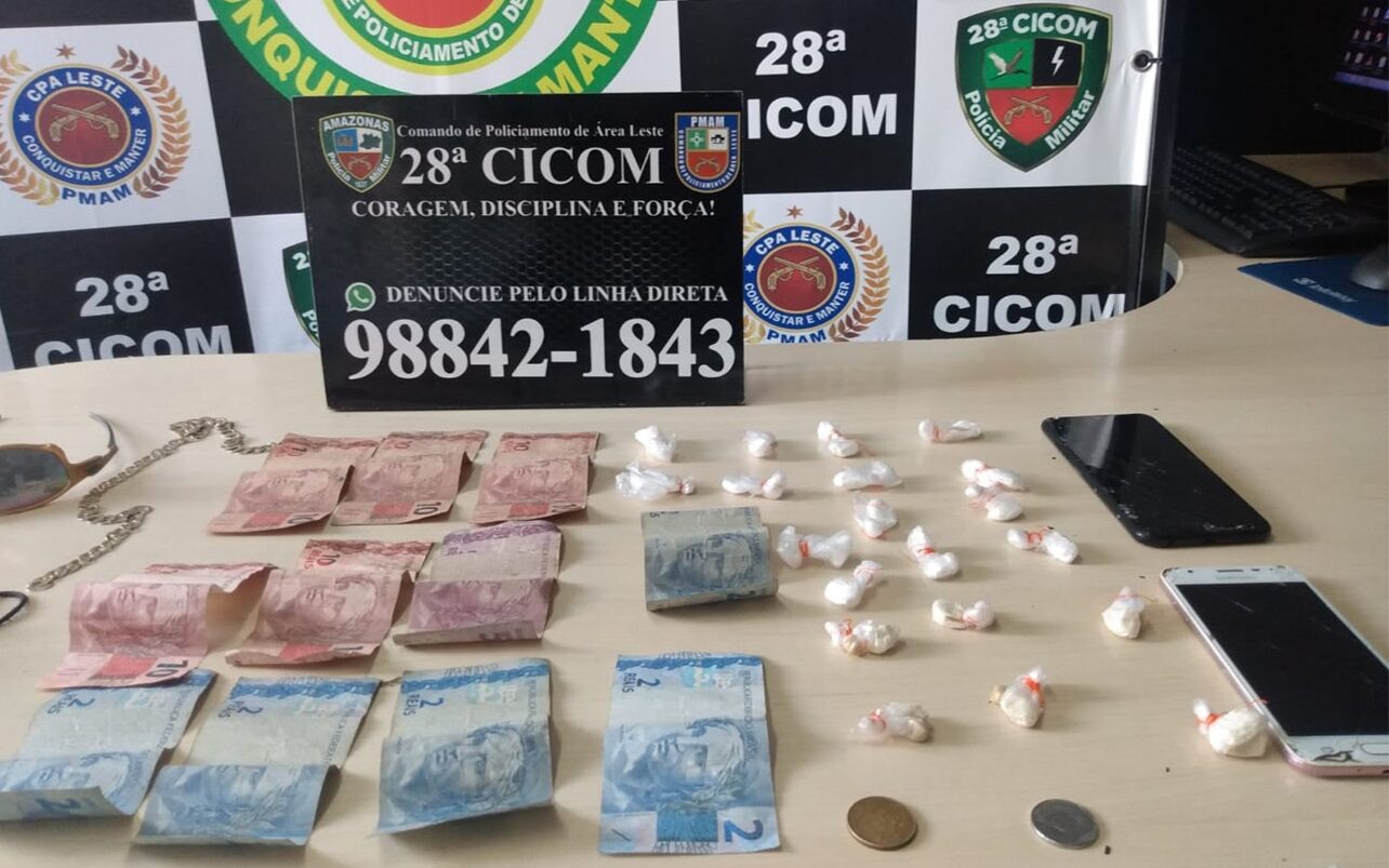 Policiais militares da Força Tática prenderam dois homens, de 24 e 28 anos, na avenida André Araújo, bairro Aleixo, zona centro-sul da capital. A dupla estava em uma motocicleta Honda, de cor preta, quando foi abordada pela guarnição. Durante abordagem pessoal, os policiais encontraram três porções de cocaína, uma arma de fogo calibre 38, e a quantia de R$ 300 em espécie. Os suspeitos foram apresentados no 1° DIP.