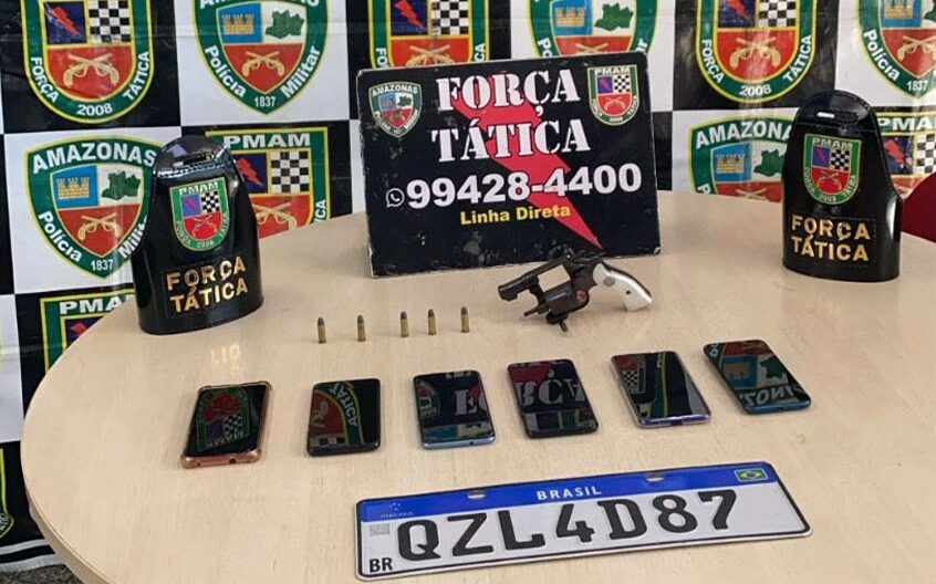 No bairro São Jorge, zona oeste de Manaus, dois homens, de 18 e 25 anos, foram presos, e um adolescente, de 16 anos, foi apreendido por policiais militares da Força Tática. Durante os patrulhamentos, os policiais avistaram um veículo tipo Onix, de cor prata, e realizaram a abordagem. Foram encontrados um revólver calibre 32, cinco munições intactas e seis celulares. O trio foi encaminhado ao 19° Distrito Integrado de Polícia (DIP).