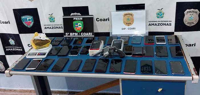 Quatro homens, com idades entre 18 e 26 anos, foram presos por porte ilegal de arma de fogo no município de Coari (a 363 quilômetros da capital). Os policiais chegaram até os suspeitos por meio de uma denúncia, que informou a localização dos homens. Na residência indicada, foram encontradas 512 porções de maconha e um revólver calibre 32.