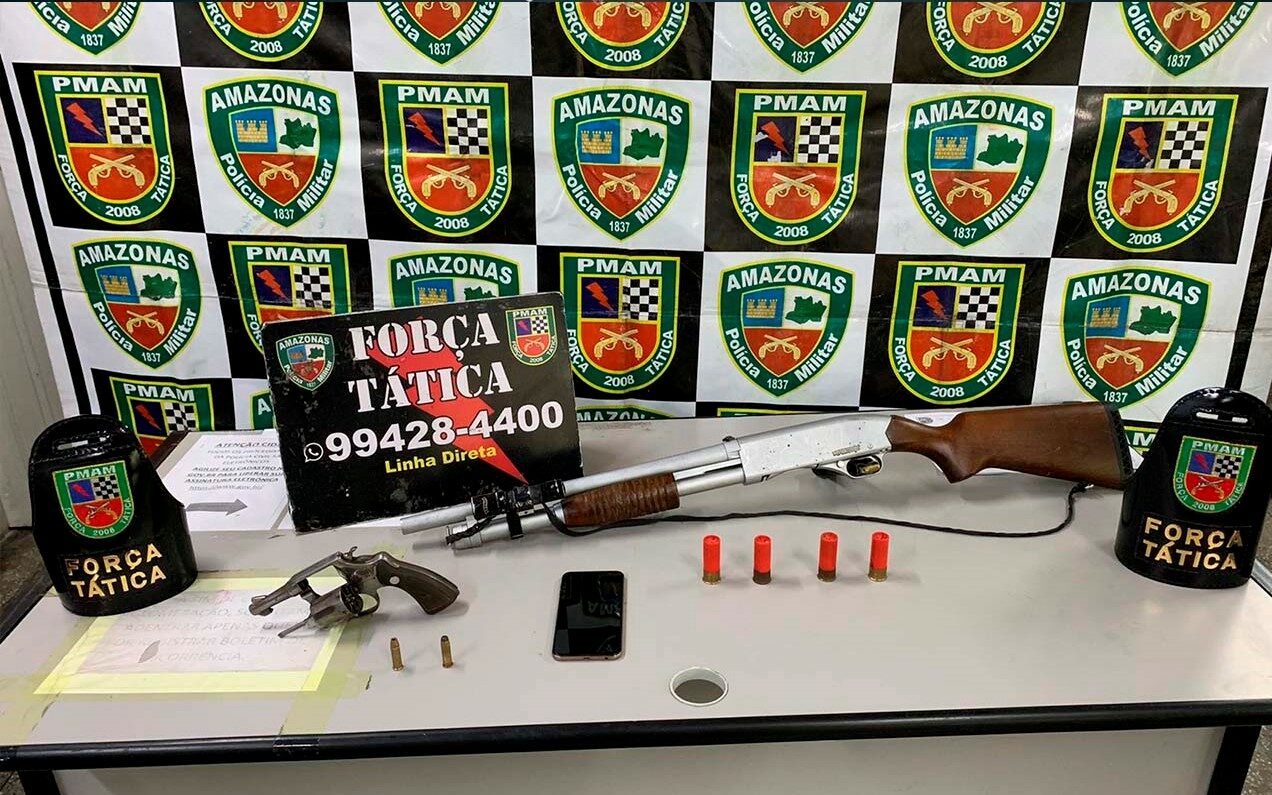 Ainda na zona norte, desta vez no bairro Novo Aleixo, um homem de 24 anos foi preso por policiais militares da Força Tática por porte ilegal de arma de fogo. A equipe policial chegou ao local após uma denúncia de que havia infratores armados no local. Os policiais identificaram um suspeito, sendo encontrada com ele uma espingarda calibre 12, com duas munições e um revólver calibre 38, também com duas munições. O infrator foi encaminhado ao 1º DIP, onde foi autuado em flagrante pelo crime.