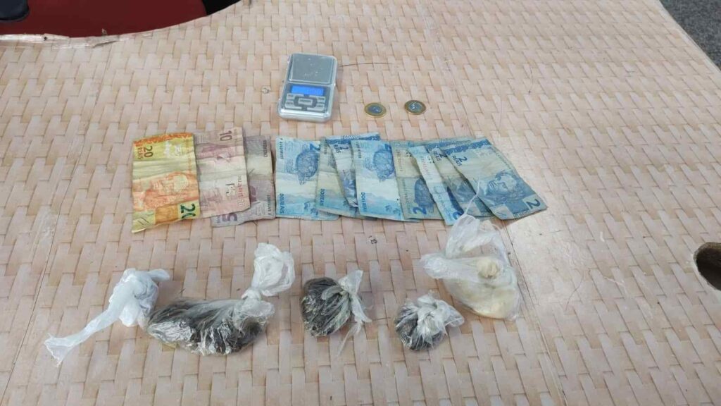 Durante a abordagem com o suspeito detido, foram encontrados uma balança de precisão; cartão de banco; R$ 53 em espécie; três porções de maconha; uma porção de pasta base de cocaína; e uma porção de oxi.