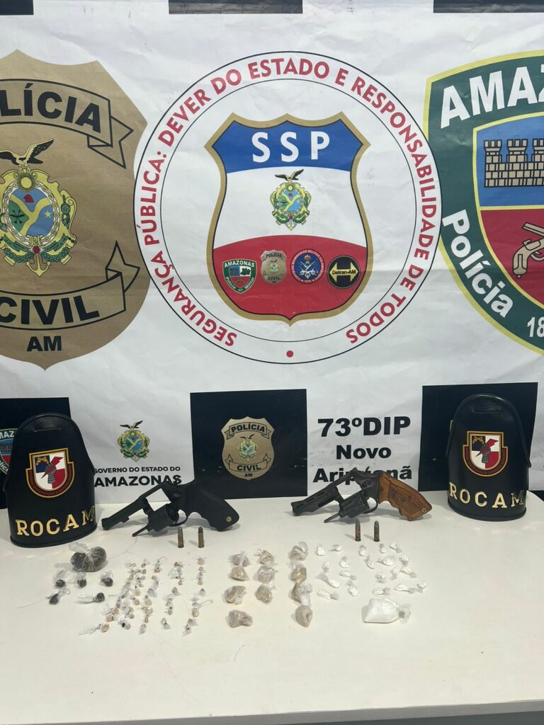 Após revista pessoal, foi apreendido um revólver calibre 38 em sua cintura e uma pochete com 55 porções de oxi, 21 porções de cocaína e seis porções de maconha. Durante buscas no local, os policiais encontraram mais uma arma de fogo e quatro munições.