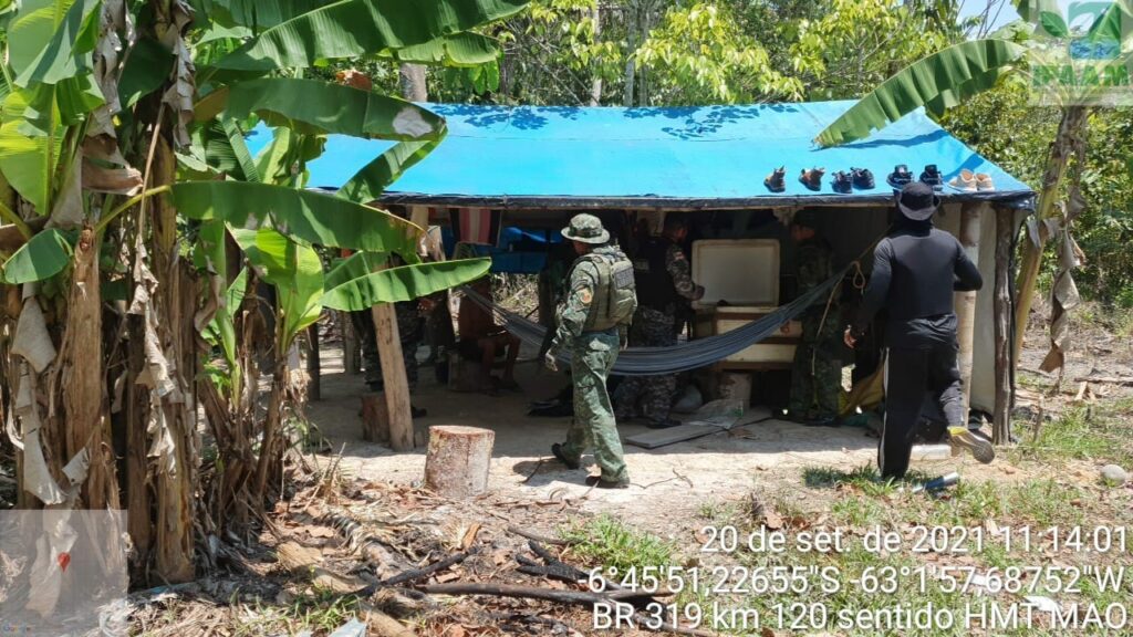 Os policiais encontraram uma pessoa que estava em um barraco alojada em situação de trabalho análoga à de escravo. No local havia um equipamento de pulverização para limpeza ilegal de áreas desmatadas.
