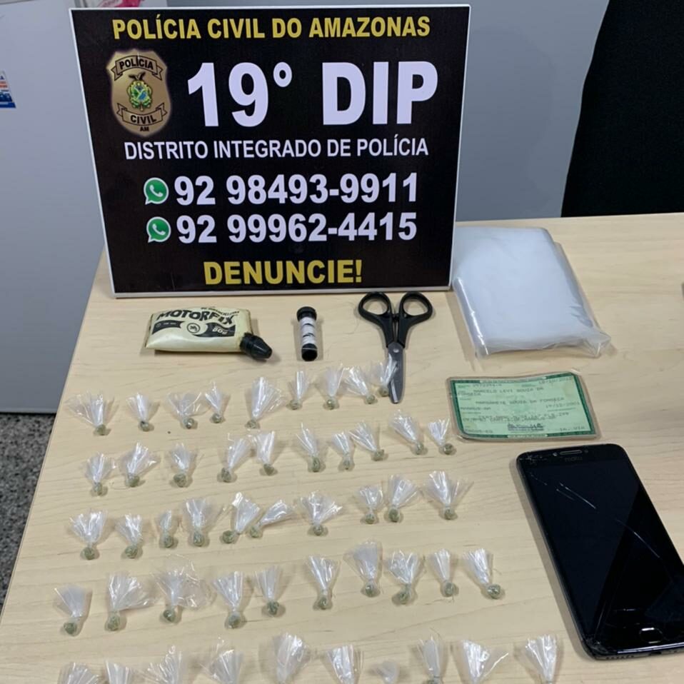 A Polícia Civil do Amazonas (PC-AM), por meio do 19o Distrito Integrado de Polícia (DIP), prendeu em flagrante nesta quarta-feira (26/05), por volta das 10h, Gabrielly Farias de Melo, 24, e Marcelo Levy Souza da Silva, 20, pelos crimes de tráfico de drogas e corrupção de menores. Com a dupla, foram encontradas 59 trouxinhas de oxi. Um menor de 17 anos também foi apreendido por ato infracional análogo ao crime de receptação. A ação policial ocorreu na Rua 1, bairro Nova Esperança, zona oeste da cidade.