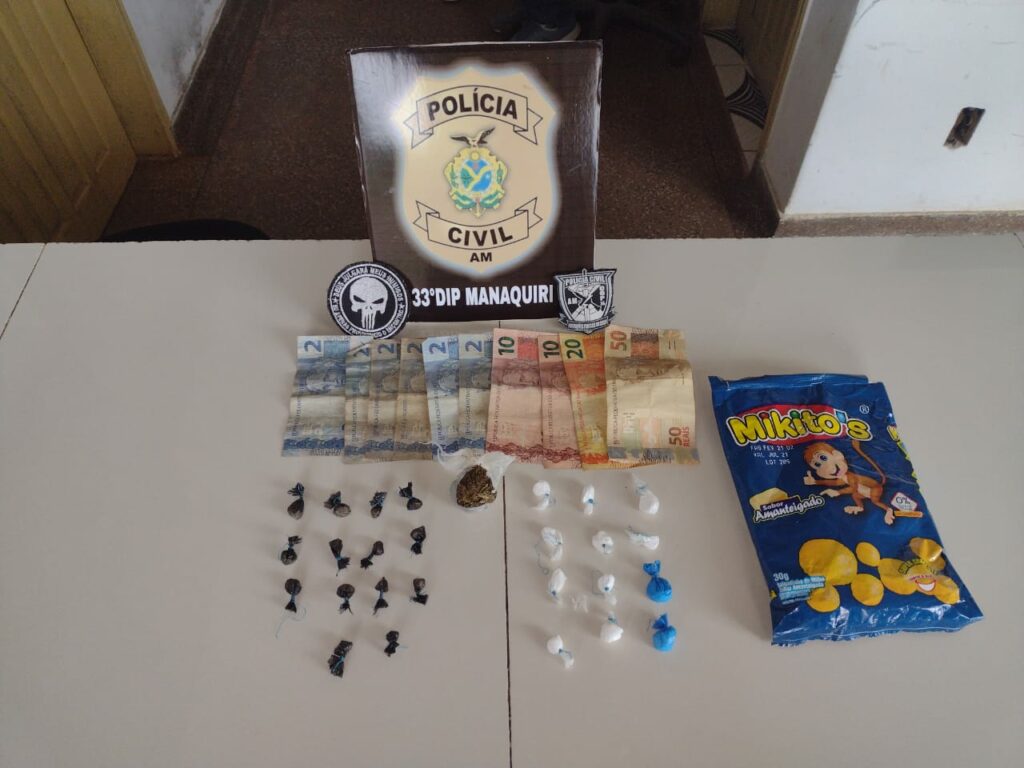Policiais civis da 33ª Delegacia Interativa de Polícia (DIP) de Manaquiri (distante 60 quilômetros de Manaus), prenderam em flagrante, na sexta-feira (14/05), por volta das 15h, um homem identificado como John Clendon Soares Samir, de 27 anos, em posse de substâncias entorpecentes e dinheiro proveniente da venda das drogas. A prisão ocorreu no bairro Novo, naquele município.
