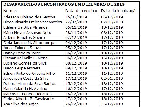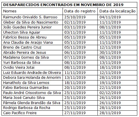 A Polícia Civil do Amazonas, por meio da Delegacia Especializada de Ordem Política e Social (Deops), divulgou nesta quarta-feira (08/01) listas de nomes de pessoas registradas, por familiares ou amigos, como desaparecidas, mas que já foram localizadas ao longo dos meses de novembro e dezembro de 2019.