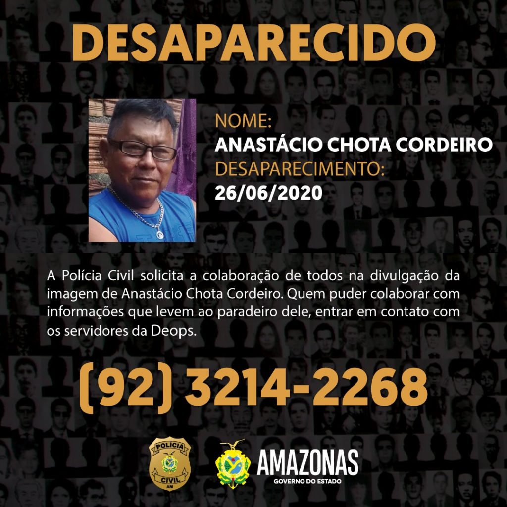 A delegada Catarina Torres, titular da Especializada, solicita a quem tiver informações sobre a localização de Anastácio Cordeiro que entre em contato com os servidores da Deops pelo número (92) 3214-2268, ou que entre em contato com a família pelo (92) 99128-6517.