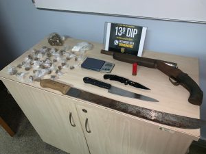 Segundo o delegado, a equipe do 13° DIP se deslocou até o local indicado, identificou o infrator e constatou que, além de portar uma escopeta e armas brancas, ele estava, ainda, comercializando entorpecentes no local.