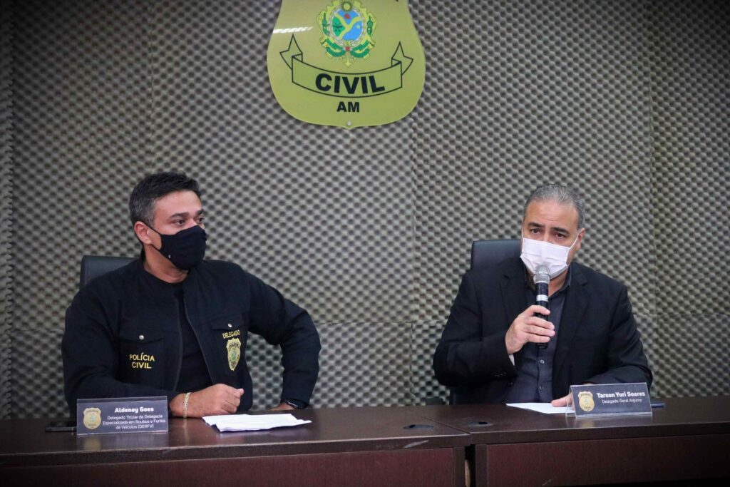 Durante a coletiva de imprensa realizada no auditório da Delegacia Geral, na avenida Pedro Teixeira, bairro Dom Pedro, zona centro-oeste, nesta quinta-feira (27/05), estiveram presentes o delegado Aldeney Goes, titular da DERFV, e o delegado-geral adjunto, Tarson Yuri, que parabenizou as equipes da Especializada pelo trabalho.