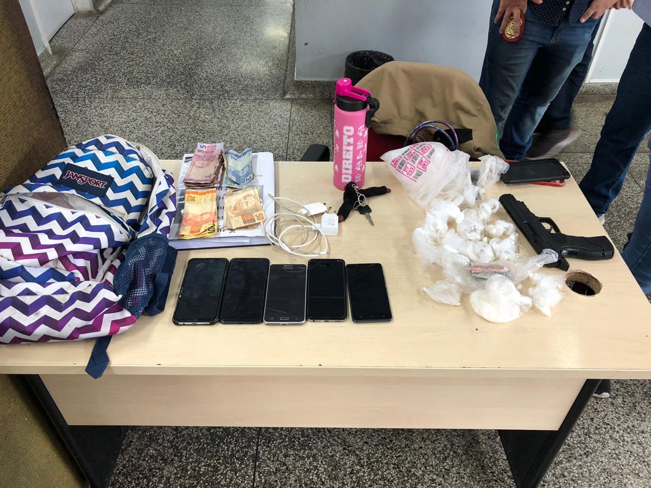 Durante revista ao lugar, foram encontrados 66 trouxinhas de oxi, 51 trouxinhas e uma porção pequena de cocaína, cinco celulares de origem duvidosa, um relógio, um simulacro de arma de fogo, R$ 302 em espécie provenientes da venda das drogas, além de ter sido feita a recuperação da motocicleta roubada.