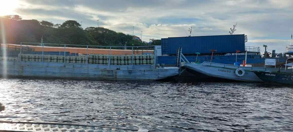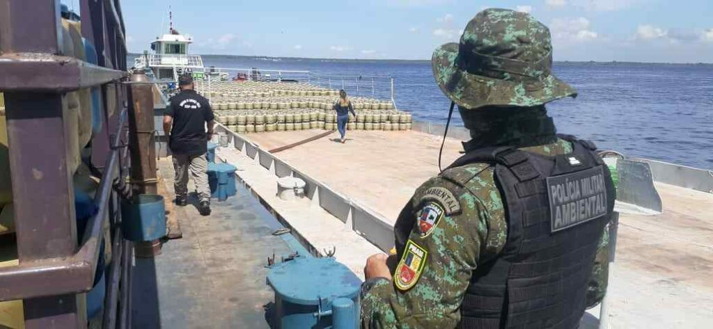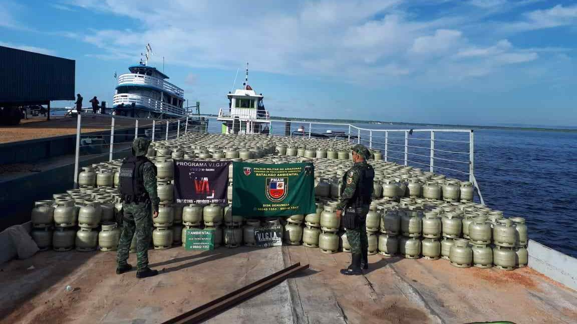 Duração fiscalização os policiais apreenderam uma balsa e um empurrador/charuto, onde estavam armazenados aproximadamente 3 mil botijas do tipo Gás Liquefeito de Petróleo (GLP).