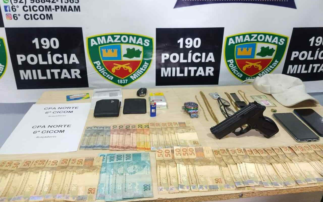Por volta das 9h30, uma equipe da 6ª Cicom foi informada sobre três indivíduos que, usando um carro sedan prata de placa QZL 4D57, haviam assaltado à mão armada um posto de gasolina localizado na avenida Atroaris. A guarnição passou a fazer buscas na região pelos suspeitos, que só foram abordados no bairro Cachoeirinha, zona sul. No interior do veículo, foi localizado um simulacro de pistola e R$ 2.238 em espécie, frutos do assalto ao posto na Cidade Nova.