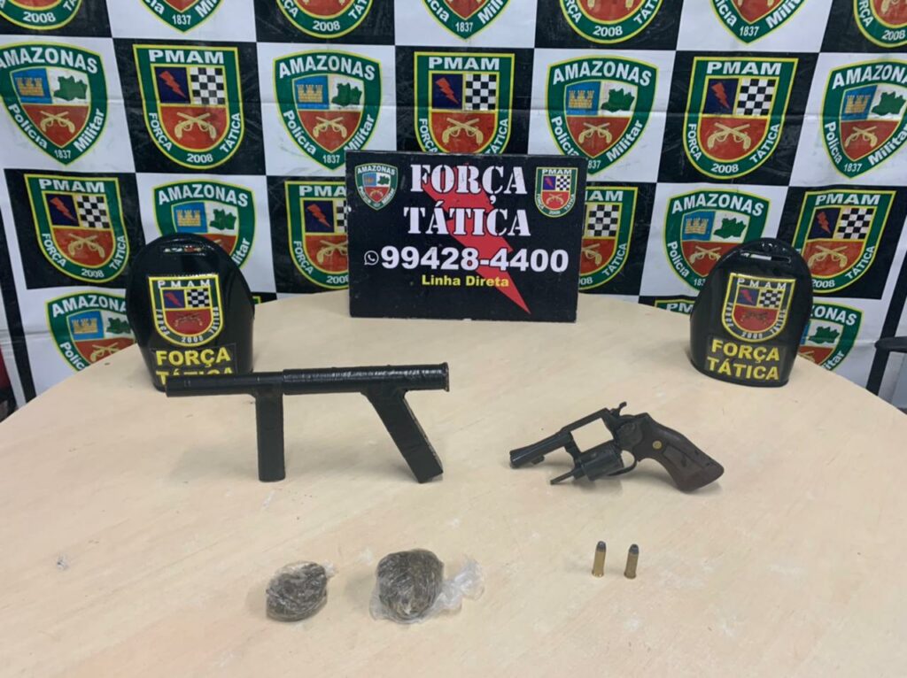 Policiais Militares da Força Tática, nesta segunda-feira (26/04) apreenderam um revólver calibre 38, com duas munições, uma arma caseira, além de duas porções de substância com aparência de maconha. O fato ocorreu na rua Belo Horizonte, bairro Tancredo Neves, zona leste de Manaus.