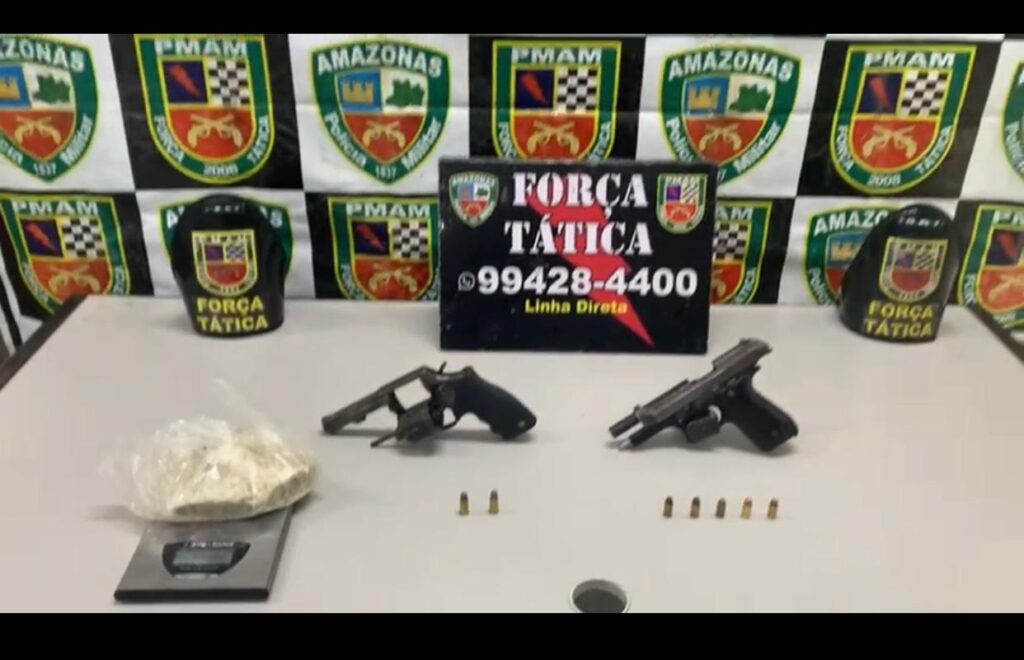 Policiais Militares da Força Tática, nesta quinta-feira (22/04), por volta das 12h20, apreenderam um revólver calibre 38; uma pistola Taurus calibre 380, além de uma porção média de substância com aparência de oxi, e uma balança de precisão, na invasão Paraíso Verde, zona norte de Manaus.