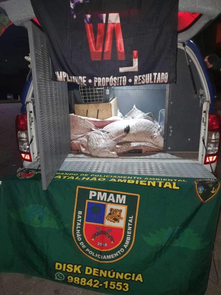 Policiais militares do Batalhão de Policiamento Ambiental (BPAmb), vinculado ao Comando de Policiamento Ambiental (CPAmb), apreenderam, durante ações operacionais na madrugada desta sexta-feira (07/05), mais de 600 quilos de carnes de origem ilegal, entre pescado e animais da fauna silvestre, avaliados em quase R$ 10 mil, transportados em duas embarcações, na orla da capital.