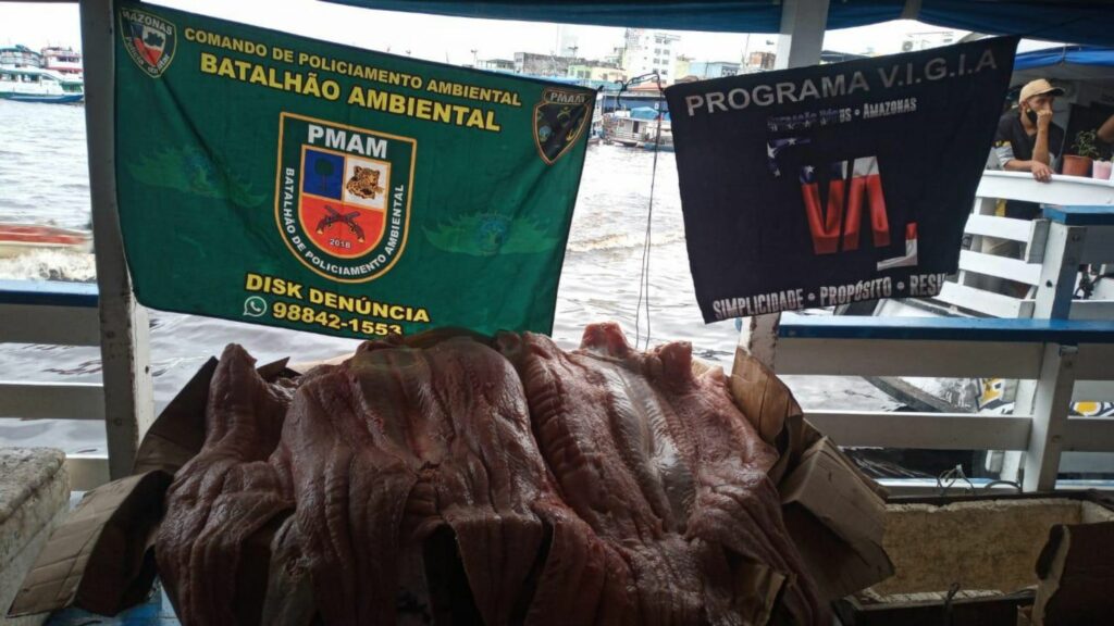 Em outra ação, por volta das 2h30, também contando com o apoio da CIPCães, após abordagem a uma embarcação oriunda de Beruri, já nas imediações da Feira da Panair, na zona sul, foram encontrados 164 quilos de carne de procedência ilegal, sendo 70 quilos de carne de capivara, quatro de paca e 90 de pirarucu fresco, avaliados em torno de R$ 2.200,00. O responsável pelo material, um homem de 28 anos, foi encaminhado para o 1º DIP.