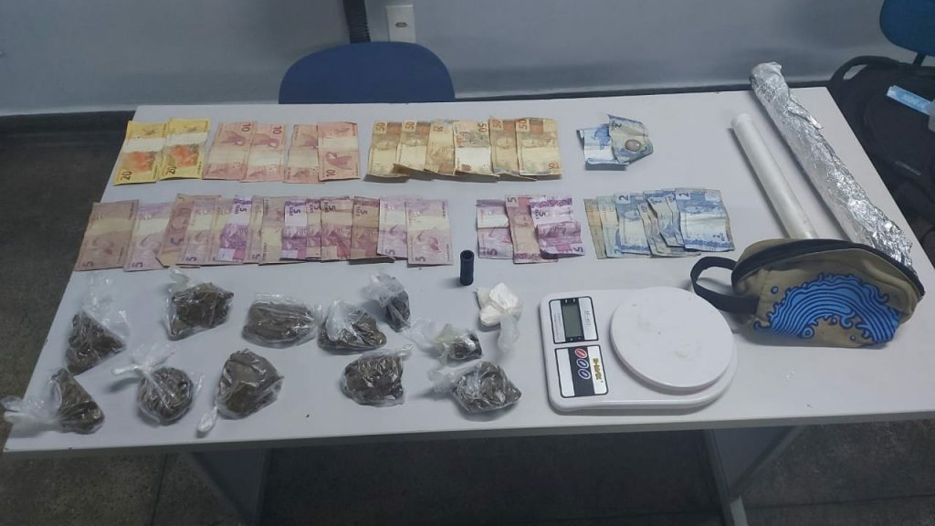 Os policiais, resgatando a mochila, encontraram em seu interior 11 porções médias com 275 gramas de supostamente cocaína; uma porção média com 60 gramas de supostamente cocaína; uma balança de precisão; um carretel de linha de costura; um rolo de filme plástico; um rolo de papel alumínio e R$ 490 em espécie.
