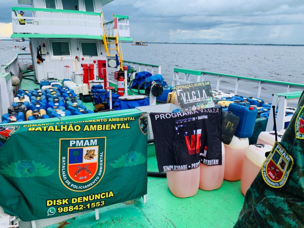 Em desdobramento da ‘Operação Hórus’, por volta das 11h30, durante patrulhamento fluvial nas proximidades da Manaus Moderna, a equipe avistou uma embarcação que estava armazenando de forma irregular galões com 5.840 litros de gasolina. Durante a abordagem, foi constatado que a embarcação possuía Licença para manuseio e transporte de produtos perigosos, mas oferecia acondicionamento indevido ao combustível. Ao lado da referida embarcação, a equipe identificou um segundo transporte fluvial do tipo Recreio, que mantinha de forma irregular, 500 litros de gasolina e 700 litros de óleo diesel no andar inferior.