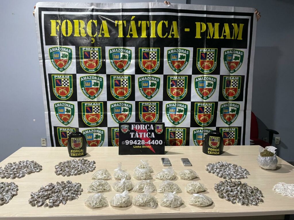Policiais Militares da Força Tática apreenderam, na noite de sexta-feira (12/03), várias porções de entorpecentes, na rua do Passeio, Bairro Novo Israel, zona norte de Manaus.